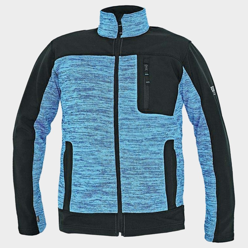 Jachetă pentru bărbați din poliester, tricot melange în combinație cu material softshell. Imprimeu reflectorizant pe mâneca și interiorul gulerului.