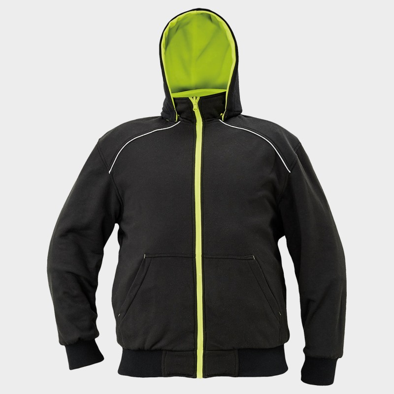 Hanorac pentru bărbați cu glugă și închidere cu fermoar. Zone întărite ale umerilor și ale cotului. Două buzunare laterale. Glugă dublu strat cu căptușeală de înaltă calitate, pentru a se potrivi cu culoarea fermoarului. Manșete elastice pe mâneci și talie.