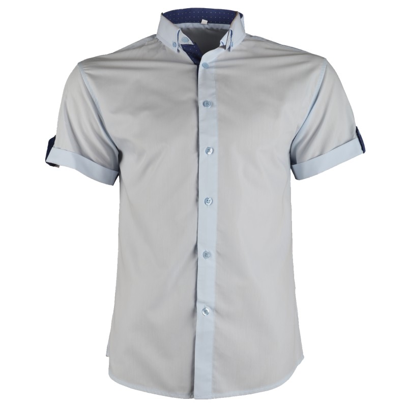 Cămașă pentru bărbați cu mâneci scurte, mulată, cu guler mic în stil italian, elemente decorative colorate.