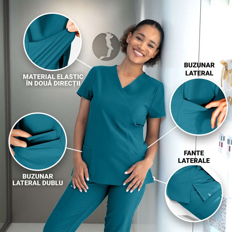 Tunică medicală pentru femei, cu croială cambrată și decolteu în V, concepută pentru confort maxim și libertate de mișcare. Realizată din material elastic și respirabil, care se mulează după mișcările corpului. Ideală pentru profesioniști din domeniul sănătății care activează în medii dinamice – medici, asistente, farmaciști și tehnicieni de laborator.