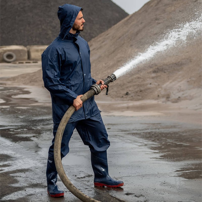 Jachetă impermeabilă și pantaloni din poliester și poliuretan. Setul este o parte adecvată a hainelor de lucru sau a echipamentului de turism. Coloana de apa de 3000mm.
