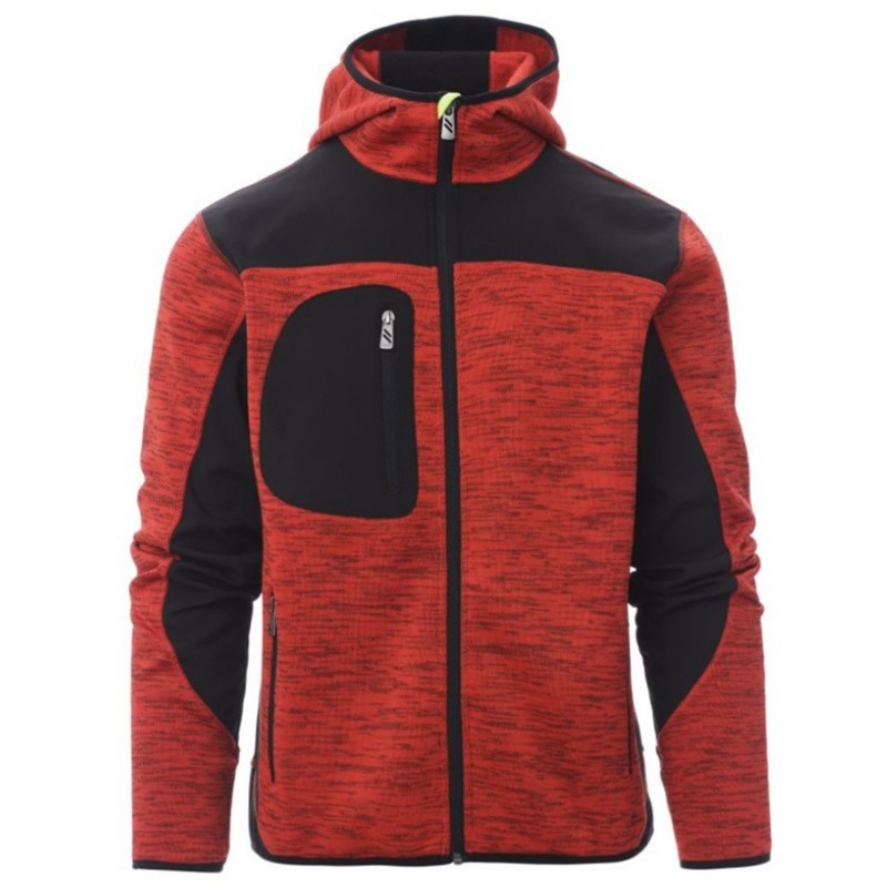 Jachetă ergonomică pentru bărbați, fermoar lung SBS cu bandă, glugă cu două cusături, benzi elastice în zona manșetelor și în talie, două buzunare laterale cu fermoar, un buzunar pe piept. Detaliu din tricot cu inserții din softshell negru.