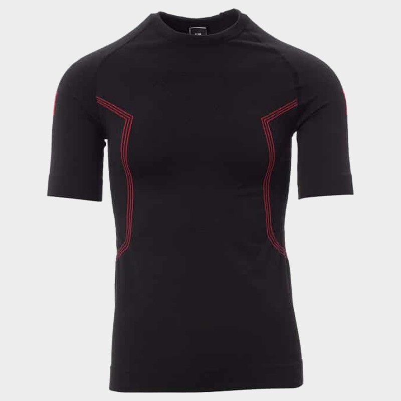 Tricou termic pentru bărbați, gât rotund, mânecă raglan scurtă. Țesătură moale și elastică, motive cu elice în relief pe ambele părți pentru a asigura o respirabilitate adecvată și o termoreglare constantă. Guler, tiv și mâneci cu tiv din același material pentru un confort mai bun. Structură ergonomică, cu rogozitate în coate pentru o adaptare perfectă la formele corpului.