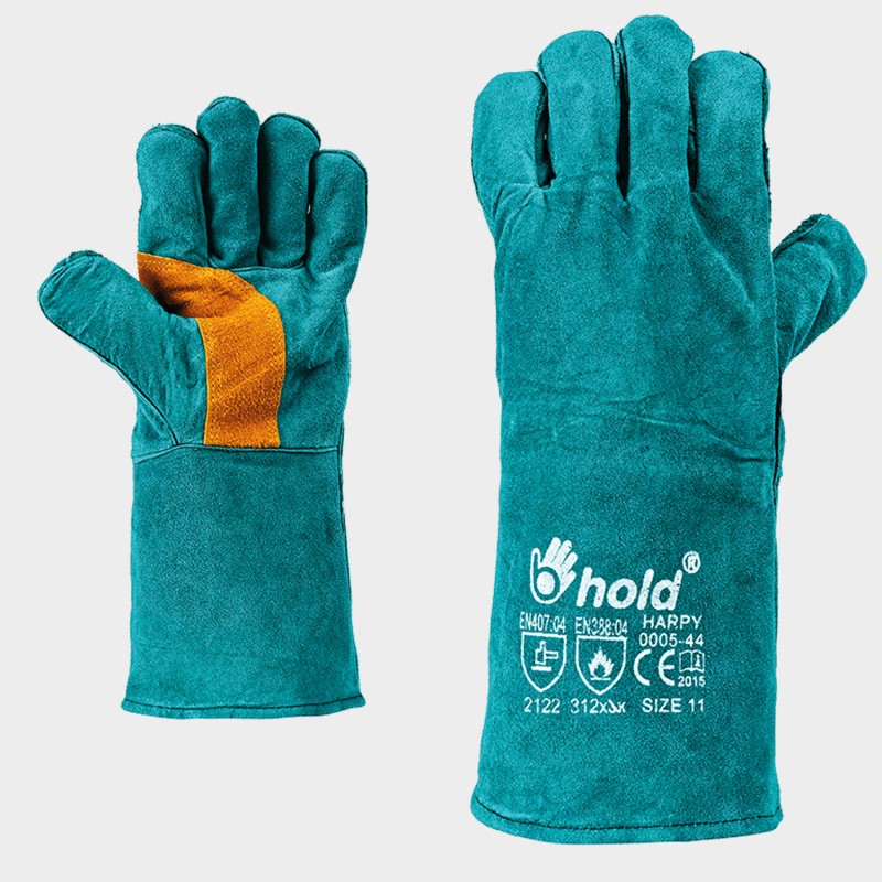 Mănuși de sudor tip A cu cinci degete, din piele de bovină, cu căptușeală din bumbac, zona palmei întărită, cusături ascunse.