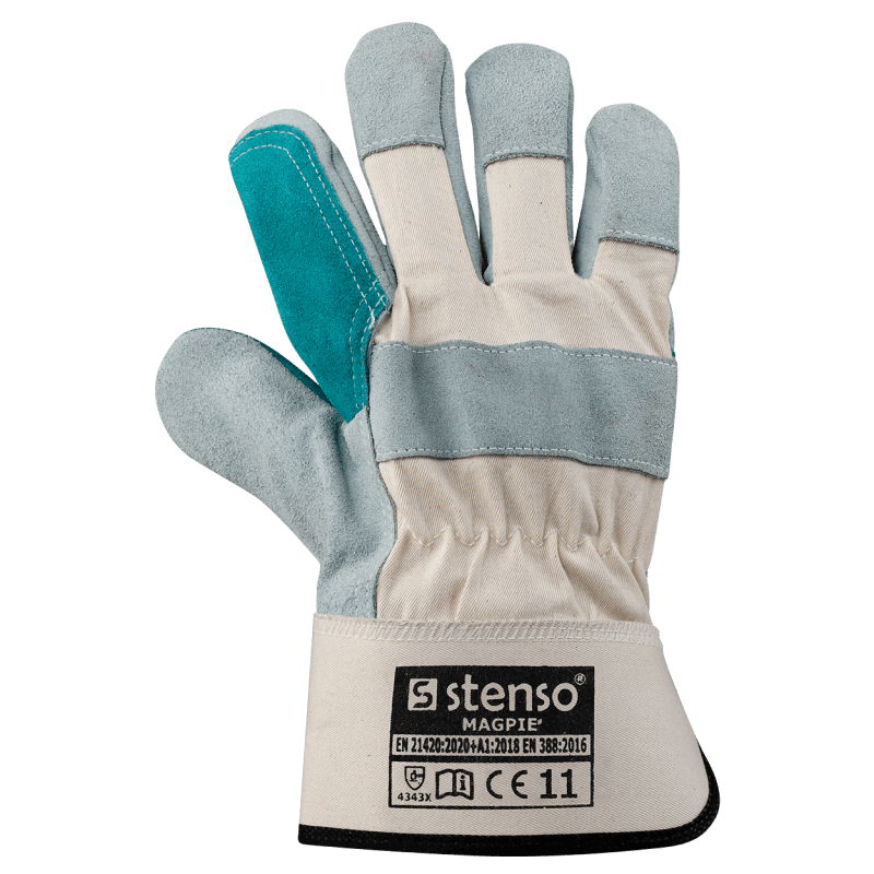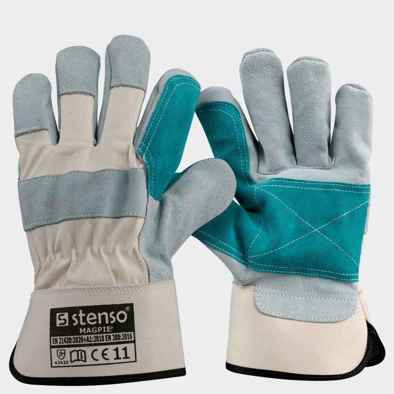 Mănuşi cu strat dublu din şpalt de bovină ca întăritură pe palmă, căptuşite, ţesătură albă din bumbac pe dos palmă, manşetă rigidă şi întărită.