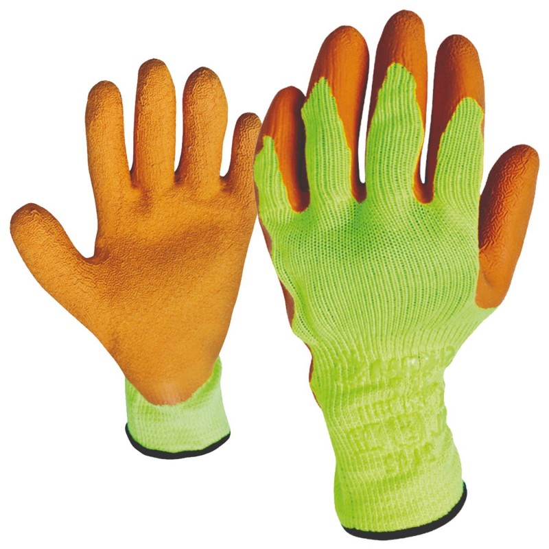 Mănuși de înaltă vizibilitate, pentru manipulare manuală intensă, palmă acoperită cu latex, tricot fără cusături, ventilate. Marcaje luminoase fosforescente, finisaj brut pe întreaga suprafață, tratament antibacterian și anti-miros, formă anatomică.