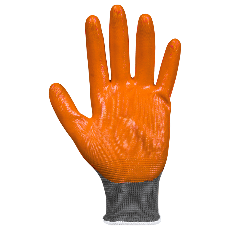 • Acoperire netedă portocalie din nitril pe palmă și degete pentru o prindere sigură.