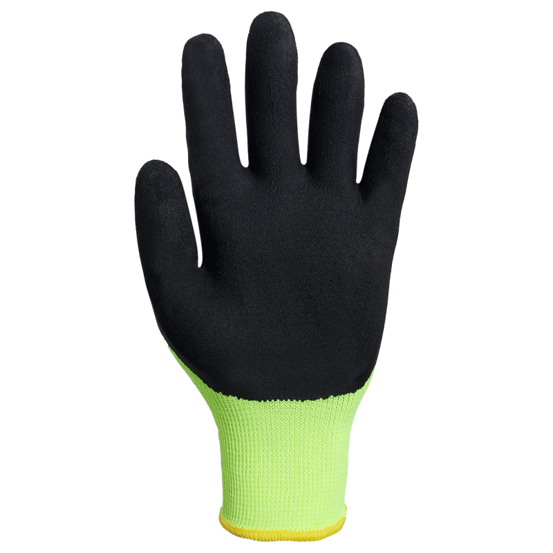 Mănuși de lucru din poliester tricotat fără cusături (13G) în culoare de HV, cu strat de spumă de latex pe palmă și degete și manșetă elastică pentru o fixare confortabilă.