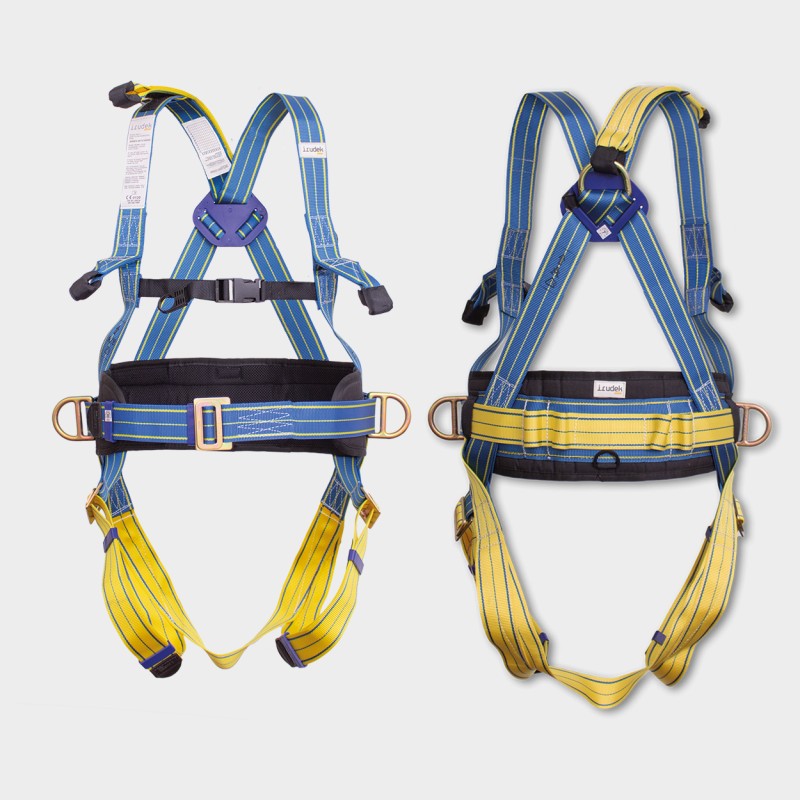 Ham bicolor cu două puncte de suspendare: unul pentru spate cu o curea de prelungire și unul pentru față cu două bucle din poliester. Bretele reglabile pentru picioare. Centura la piept. Centură de siguranță.