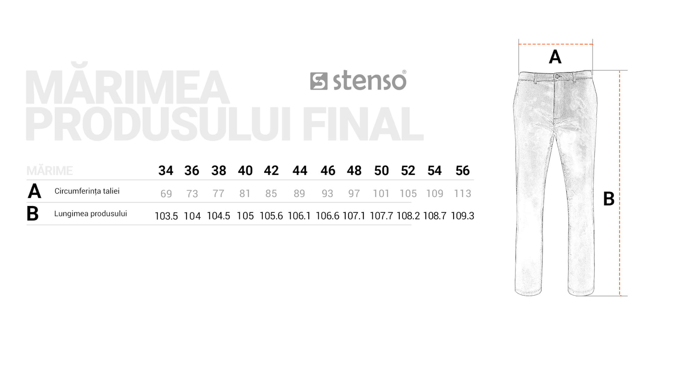 Pantaloni unisex, cu două buzunare în față și două la spate, cu bandă elastică în talie, închidere cu fermoar și nasturi, croi ajustat.