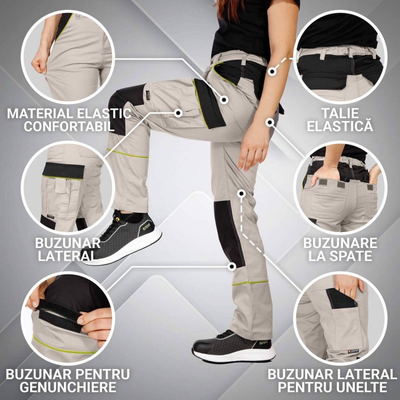 Pantaloni de lucru de damă cu talie elastică confortabilă și un design atractiv, cu accente contrastante, care îmbină stilul și funcționalitatea.