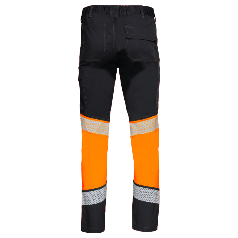 Pantaloni de lucru cu vizibilitate ridicată, cu design contrastant negru și portocaliu fluorescent, ideali pentru condiții de lumină scăzută.