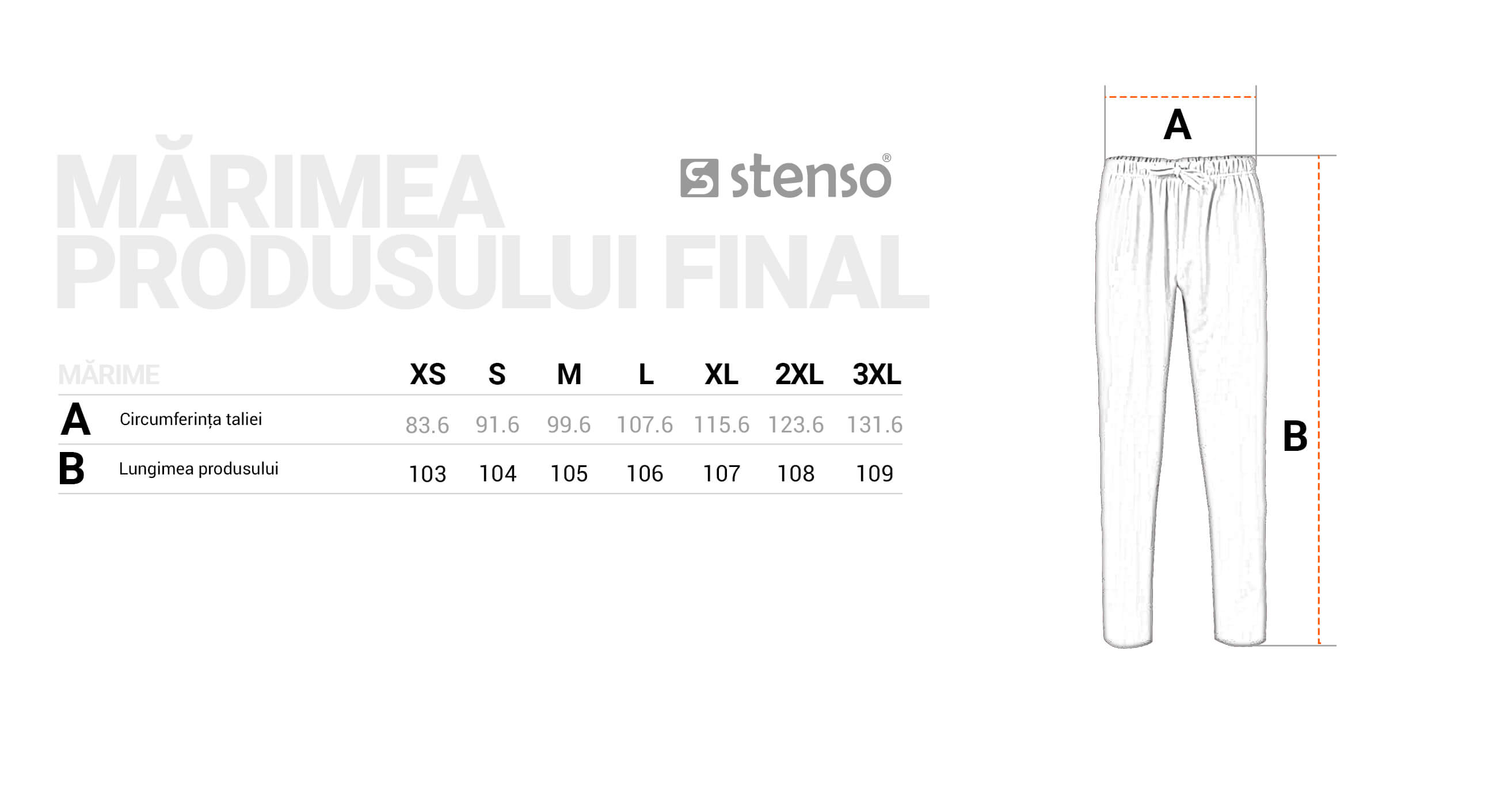 Pantaloni, talie elastica cu șireturi, două buzunare în față și unul la spate. Material hidrofug, rezistent la pete, antibacterian, respirabil. Croială liberă.