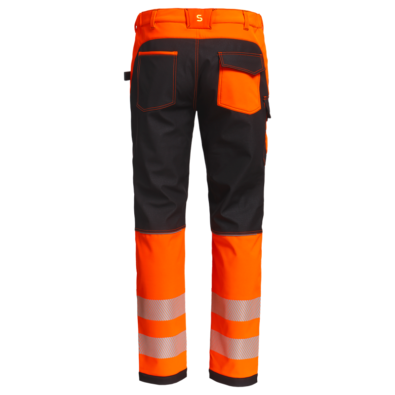 Pantaloni de lucru cu vizibilitate ridicată, croială ergonomică, realizați din material softshell hidrofug, căptușeală călduroasă din microfleece.