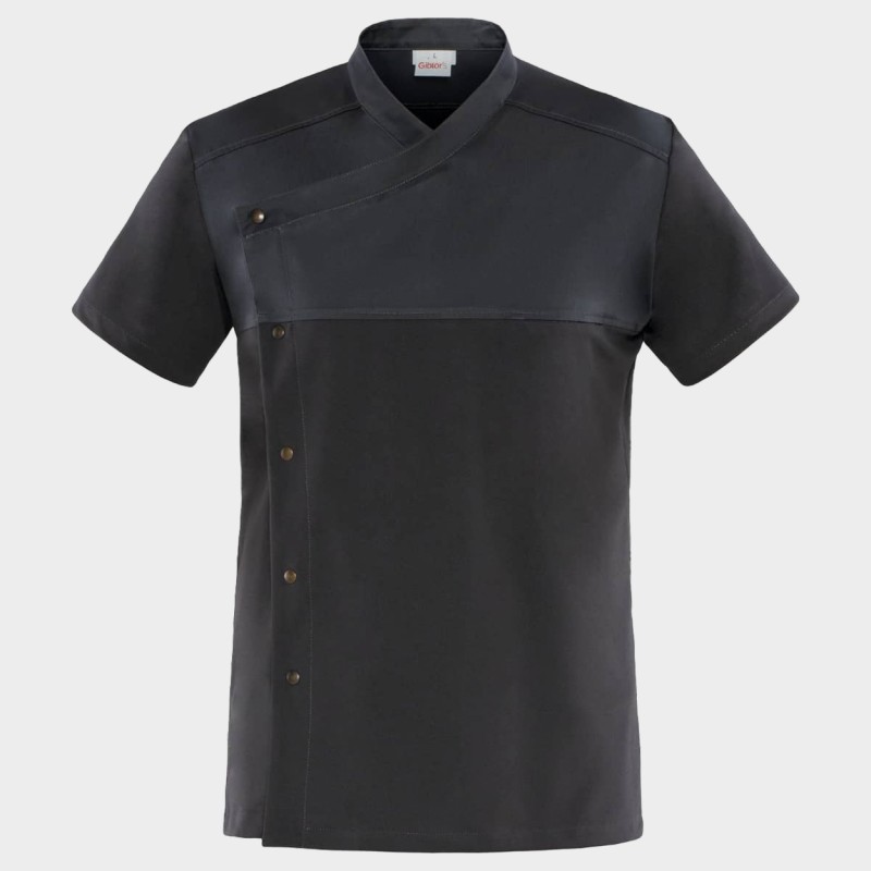 Tunica pentru bucătari. Închidere cu nasturi, buzunar superior ascuns la piept, plasă pe spate.