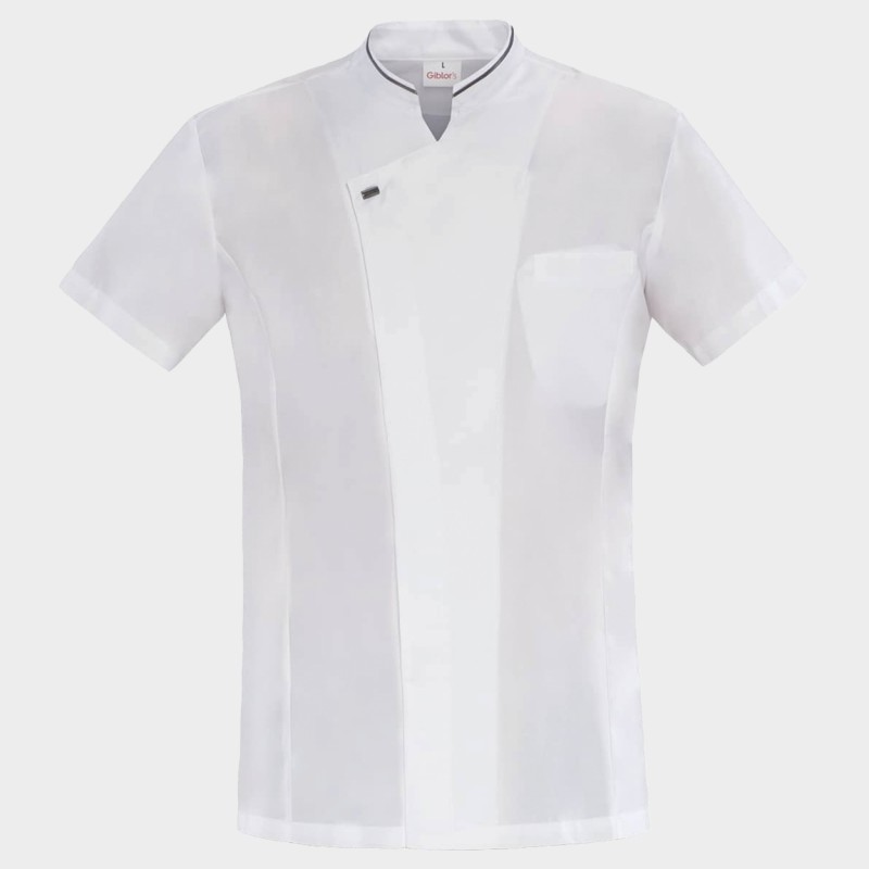 Tunica pentru bărbați cu mâneci scurte, închidere cu nasturi și buzunar superior ascuns în zona pieptului.