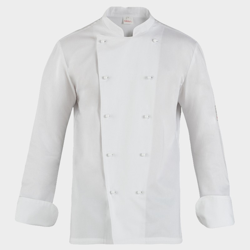 Tunică pentru bucătar cu mânecă lungă, buzunar pentru pix pe mânecă, închidere cu nasturi detașabile, croi mulat.