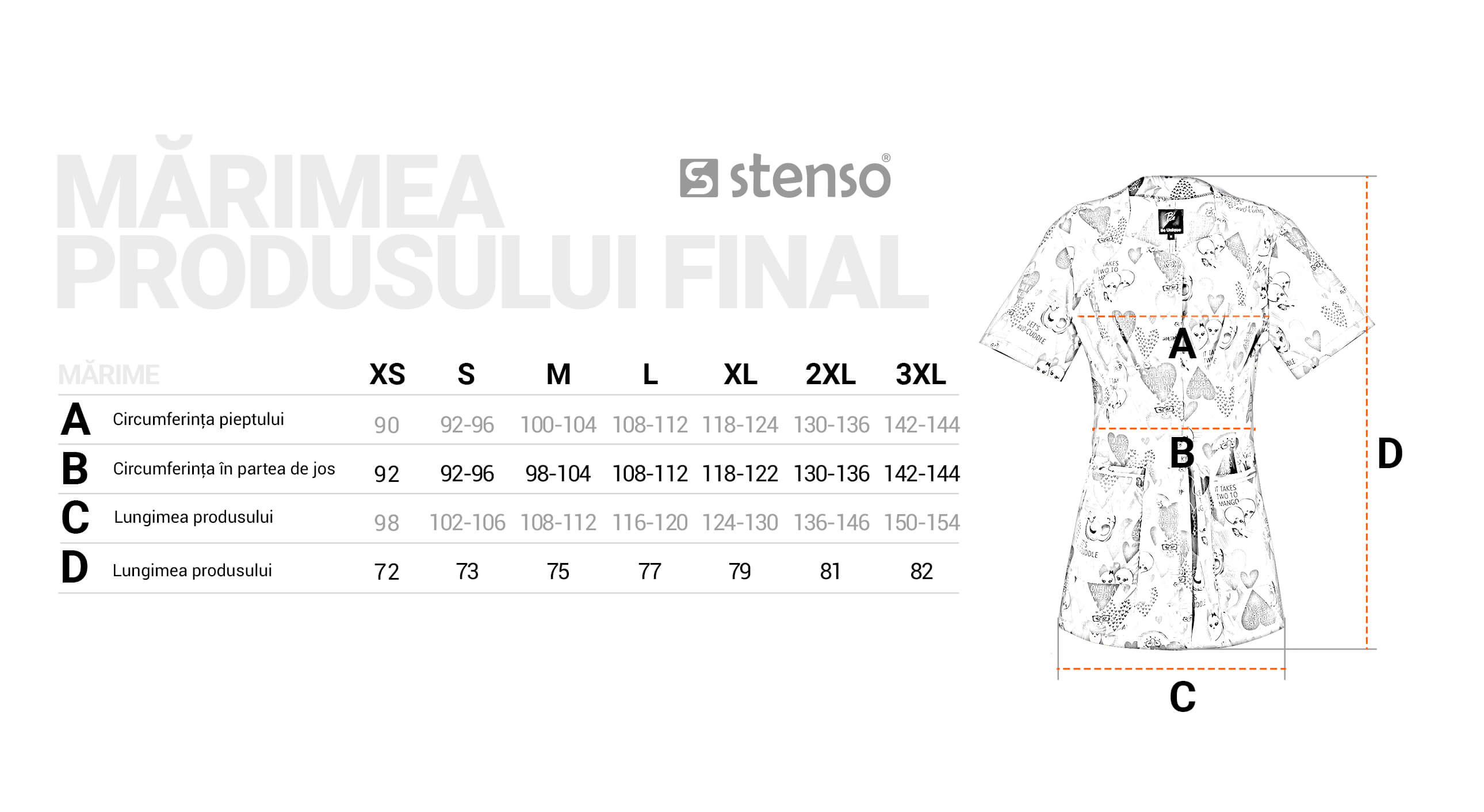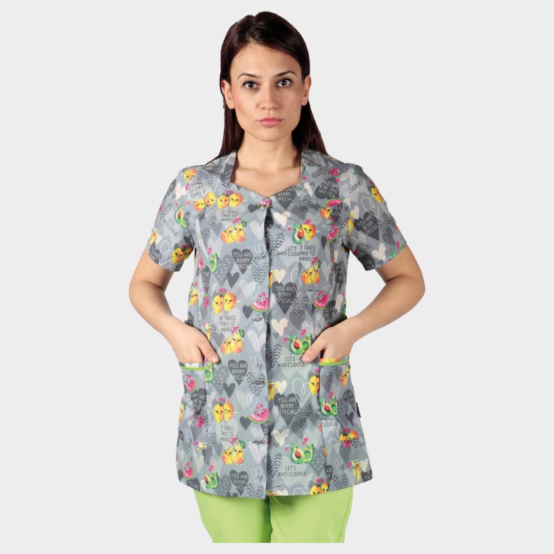 Tunica pentru dame cu mâneci scurte, trei buzunare și închidere cu nasturi.