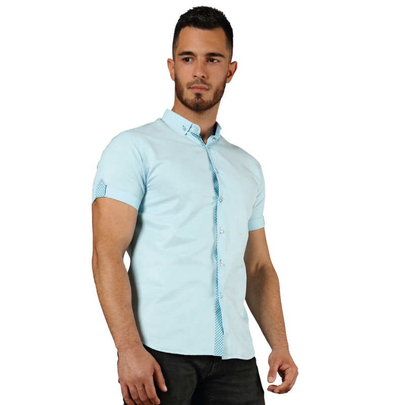 Cămașă pentru bărbați cu mâneci scurte, mulată, cu guler mic în stil italian, elemente decorative colorate.