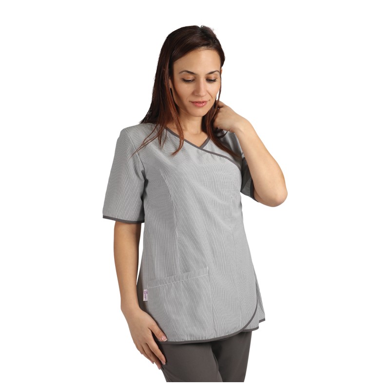 Tunica pentru dame cu mâneca scurta, cu un buzunar, șireturi și ornamente de culoare contrastantă.