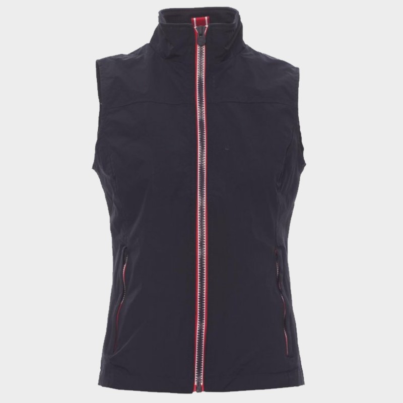 Vestă pentru dame cu fermoar contrast de 8 mm, două buzunare exterioare cu fermoar acoperit. Interior: cu plasă, fără căptușeală, un buzunar cu fermoar și orificiu pentru căști.
