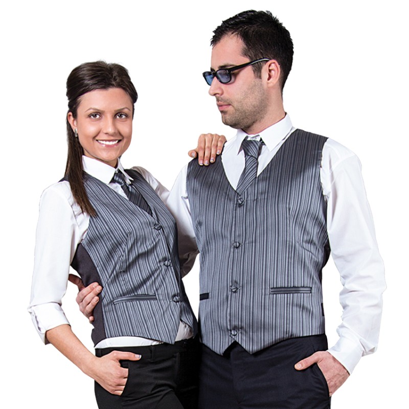 Vestă pentru bărbați, spate din gabardină, închidere cu patru nasturi, două buzunare cu file în față, centură de ajustare a taliei plasată pe spatele vestei.